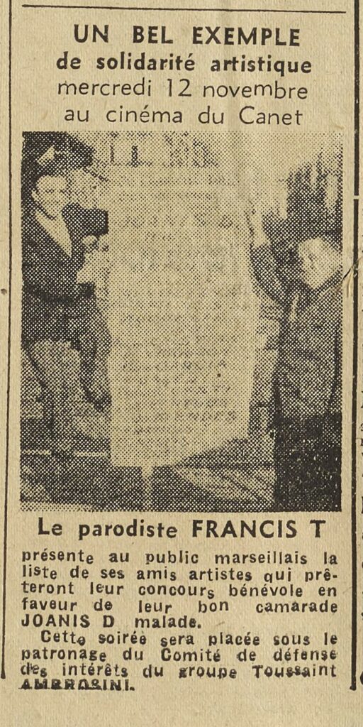 Journal “Le Petit Provençal”, 8 novembre 1941, p. 2, RetroNews – Le site de presse de la BnF, « FRANCIS T », (lire en ligne)